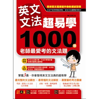 英文文法超易學:1000 題老師最愛考的文法題購買網址:http://www.books.com.tw/exep/assp.php/87926/products/0010565719?utm_source=87926&utm_medium=ap-books&utm_content=recommend&utm_campaign=ap-201706