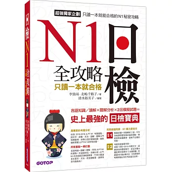 言語知識+讀解+聽解,所有JLPTN1的重點一本通通到位。詳細分析JLPTN1的各題型及解題要領,不用分開讀多本單字、文法、或是聽解書,讀書效率市面最高!